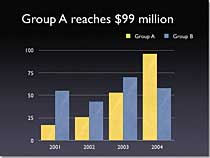 但是,表格可能缺乏视觉效果。例如,如果您希望说明您们做出的贡献显著高于其它两个部门,最好以条线图(见下图)的形式进行说明。但如果您希望弱化您们的贡献低于其它部门这一事实,用表格传达信息就可减少人们的注意力或感情色彩。
